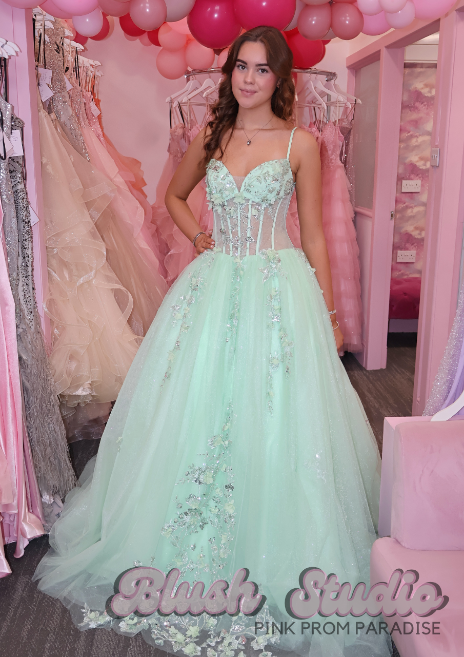 The Huda dress is the perfect choice for girls who want to turn heads! The sheer bodice has a stunning beaded detail cascading onto the skirt. It also has a lace up back with a optional panel to cover your back. This dress is an ultimate XL princess ballgown